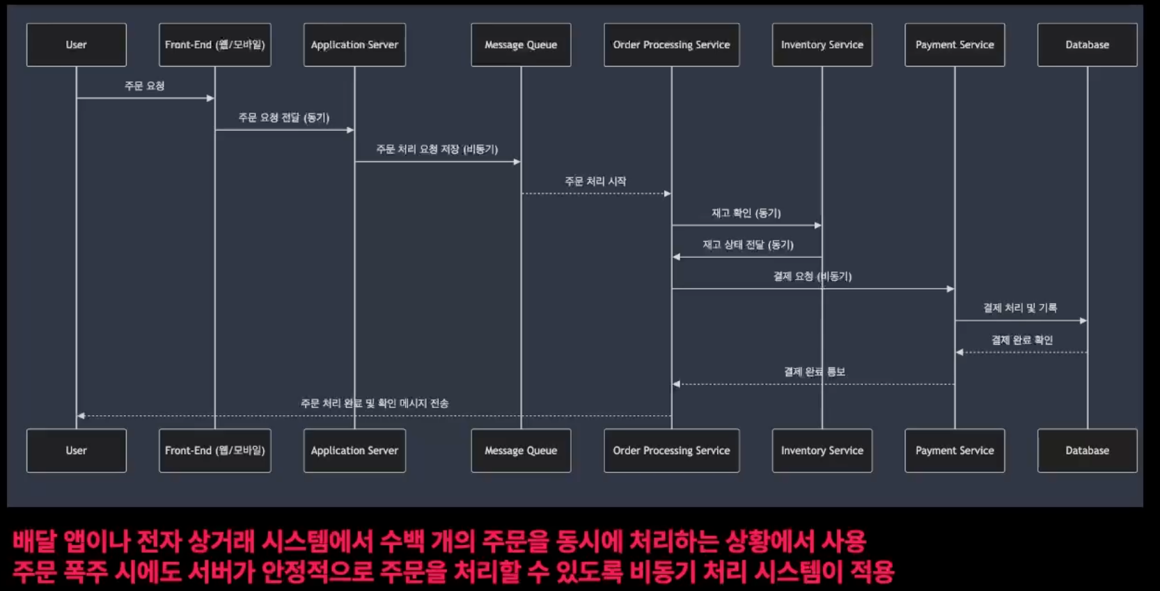 - 비동기 메시징 시스템과 함께 사용되며, 대규모 트래픽 상황에서 시스템의 안정성을 보장하는데 도움
