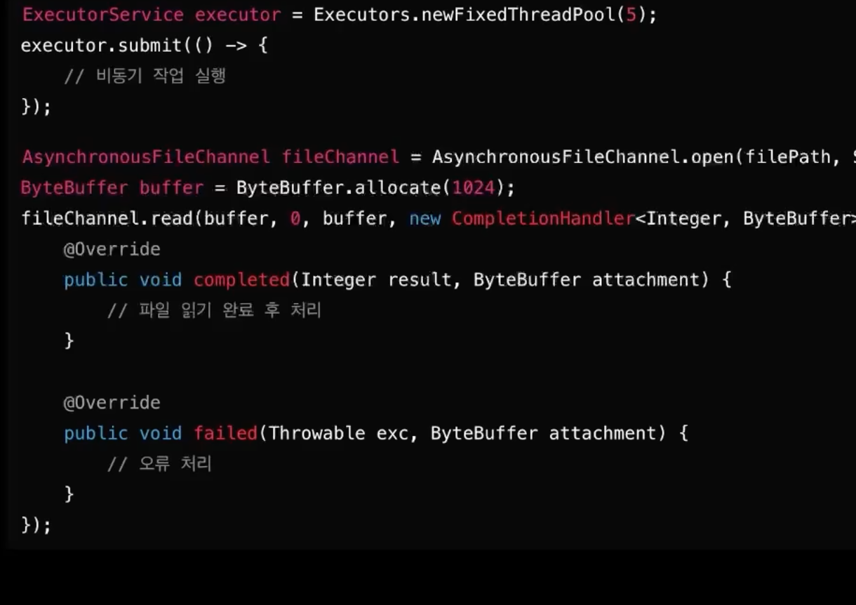 - I/O 작업 (파일 읽기, 네트워크 요청 등)은 처리 시간이 길어질 수 있음